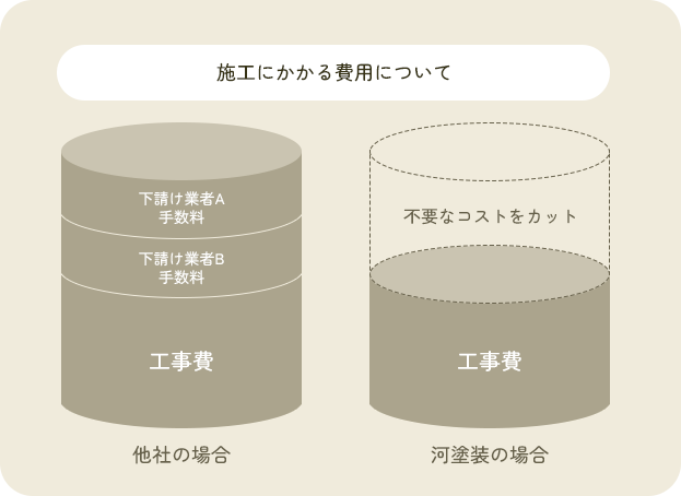 河塗装では、ヒアリングから施工完了まで一貫対応を行っております。中間マージンがかからないため、コストを抑えつつも品質にこだわったご提案が可能です。